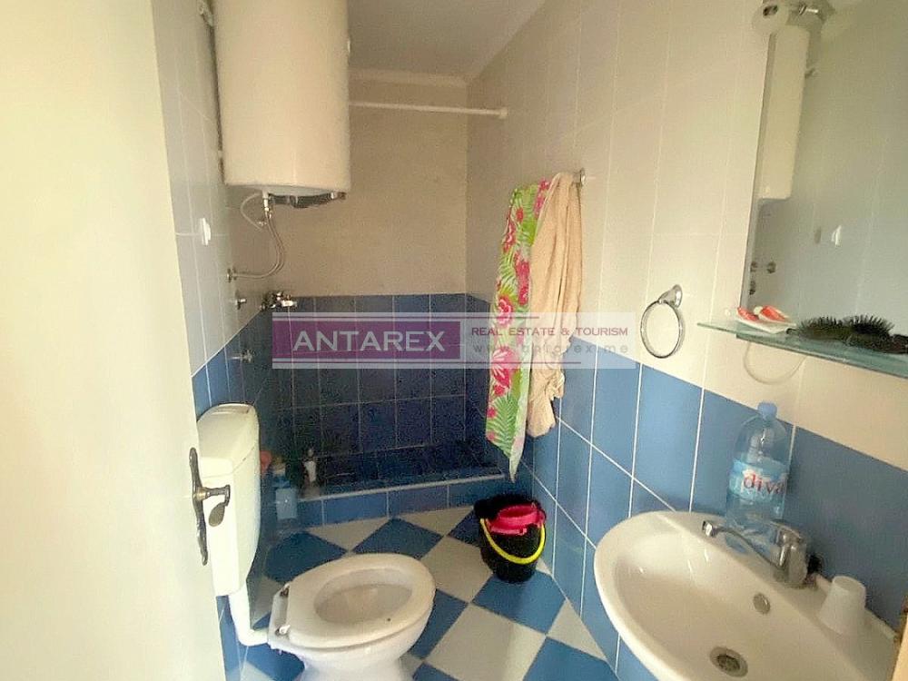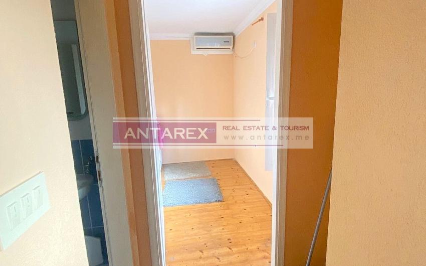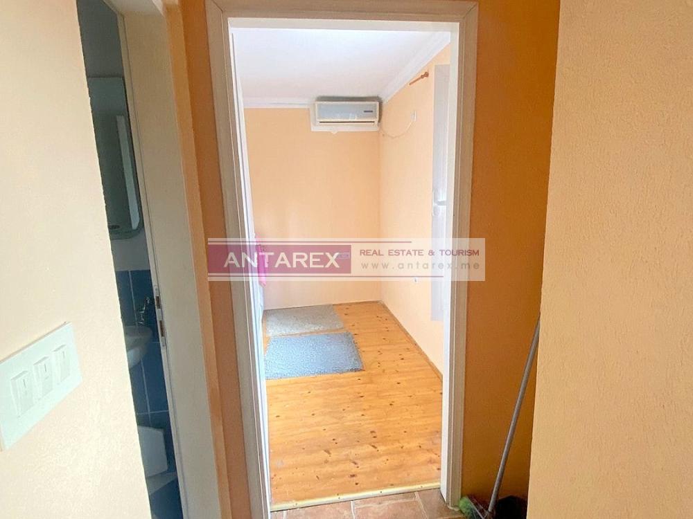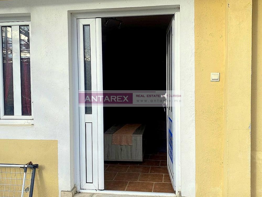 This apartment is located on the ground floor of a small apartment building in the residential area of Topla 3. It is 34 square meters and consists of a kitchen, living room, bedroom, and bathroom. A 25 square meter courtyard is included in the price, which can be used as a terrace or parking space. The apartment is sold furnished and includes all appliances.