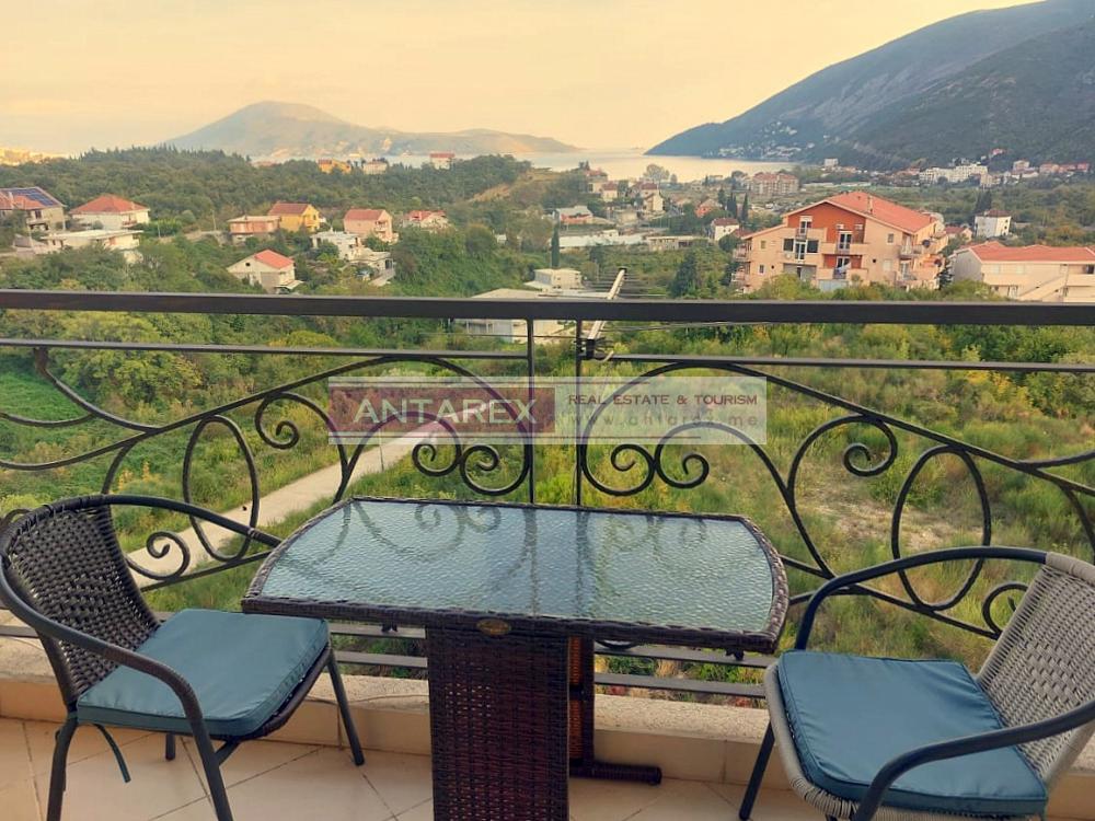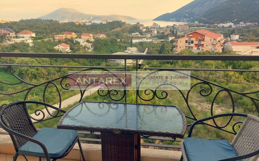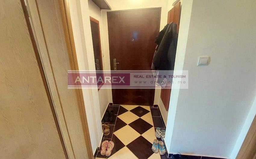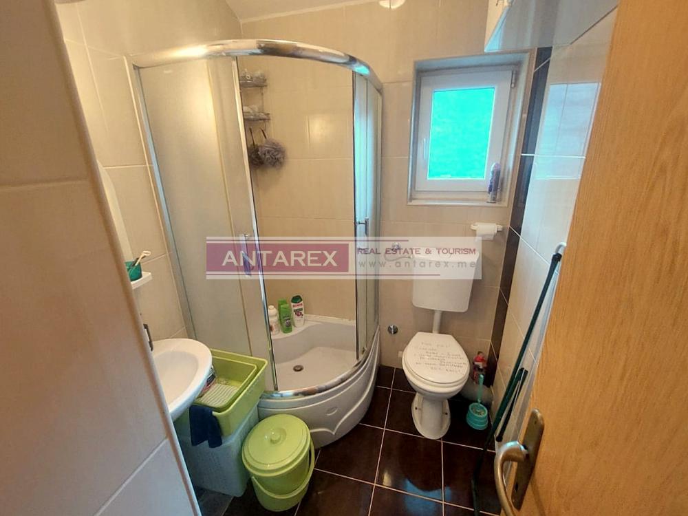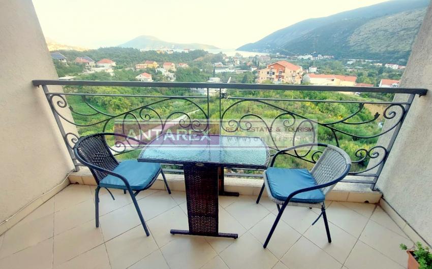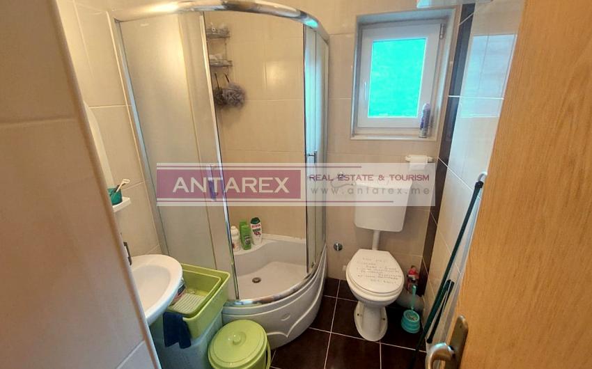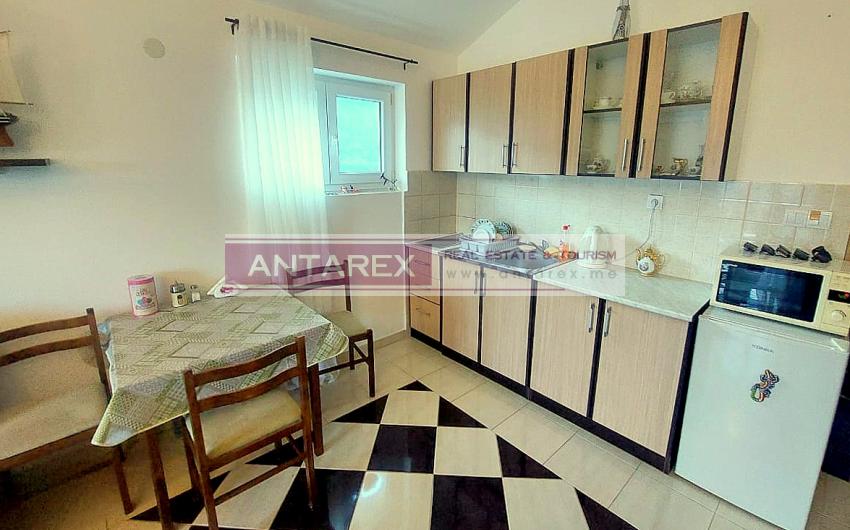 A cozy one-bedroom apartment on the top floor of a small apartment building in Igalo is available for long-term rent. The total area is 43 square meters and includes one bedroom, a living room with a kitchen area, a bathroom, and a terrace with a sea view. The apartment is furnished, well-maintained, and includes air conditioning and other necessary appliances.