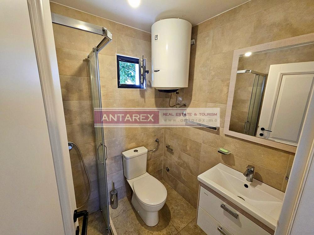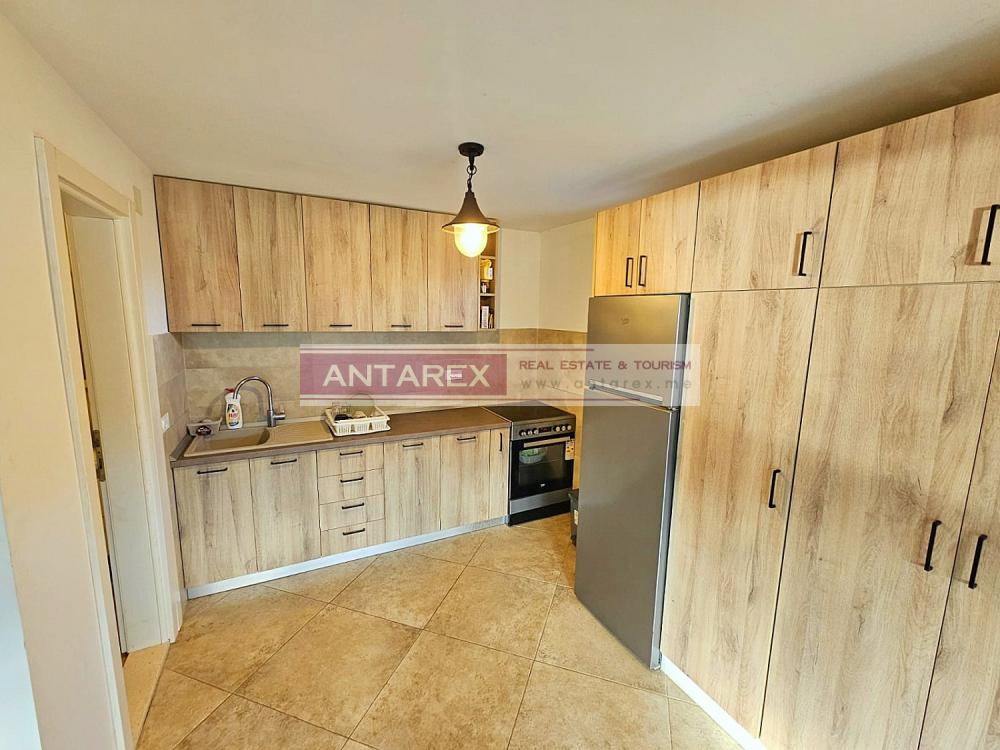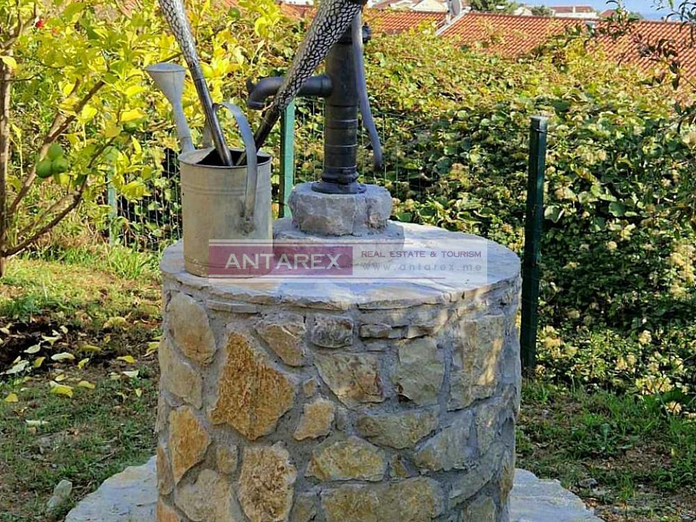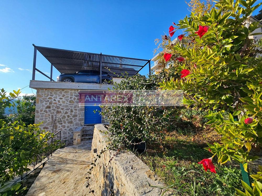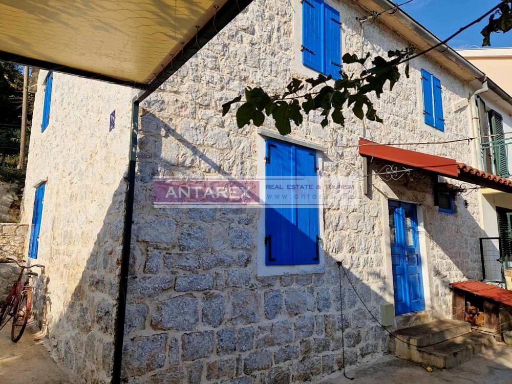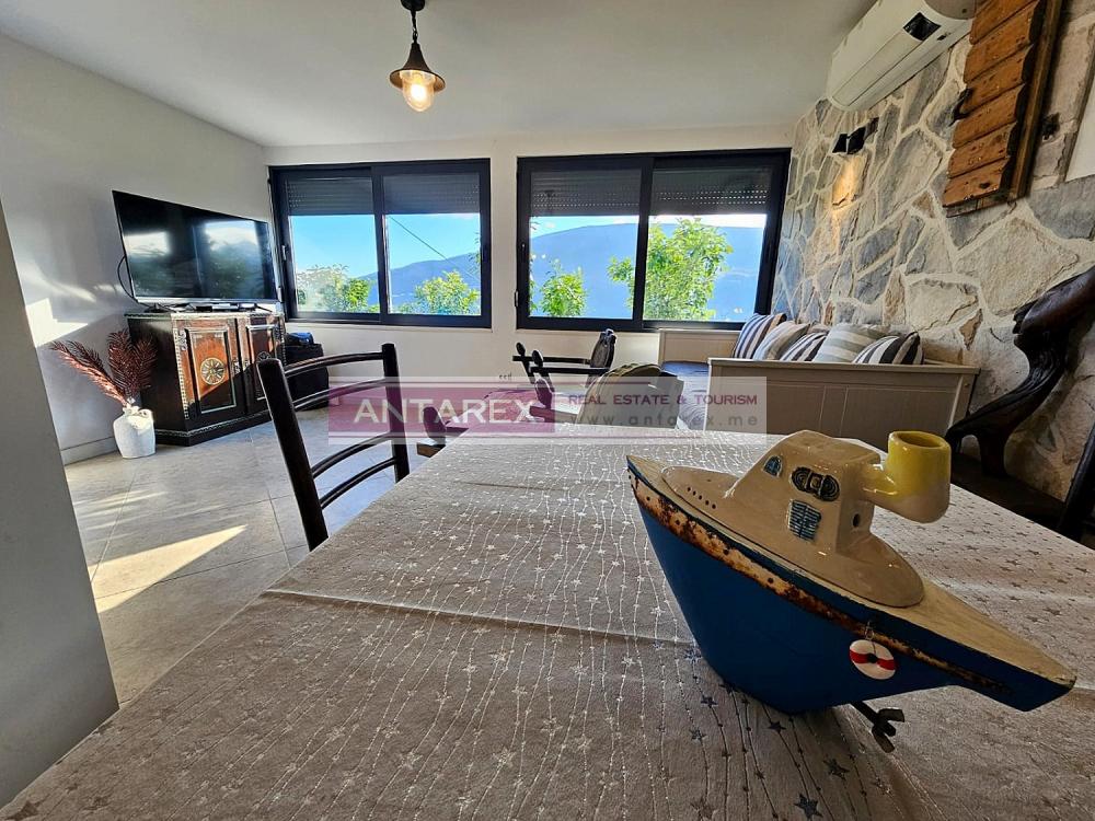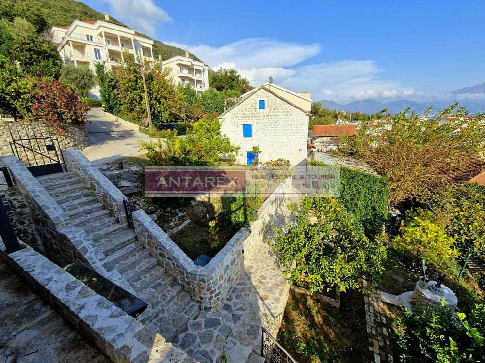 For sale is an isolated part of a stone house, divided vertically, in the resort village of Djenovici. The plot and the windows of the house offer panoramic views of the sea and the elite complex Portonovi. The area of the house is 76 sq.m., restored from the outside, the interior needs cosmetic repairs. On the ground and first floors there is a duplex apartment with three bedrooms. In a separate building there is a studio of 30 sq.m., it has been well renovated, furnished and equipped with household appliances. On the roof of this building there is a parking for two cars.