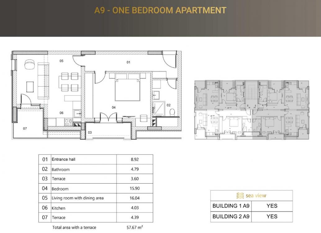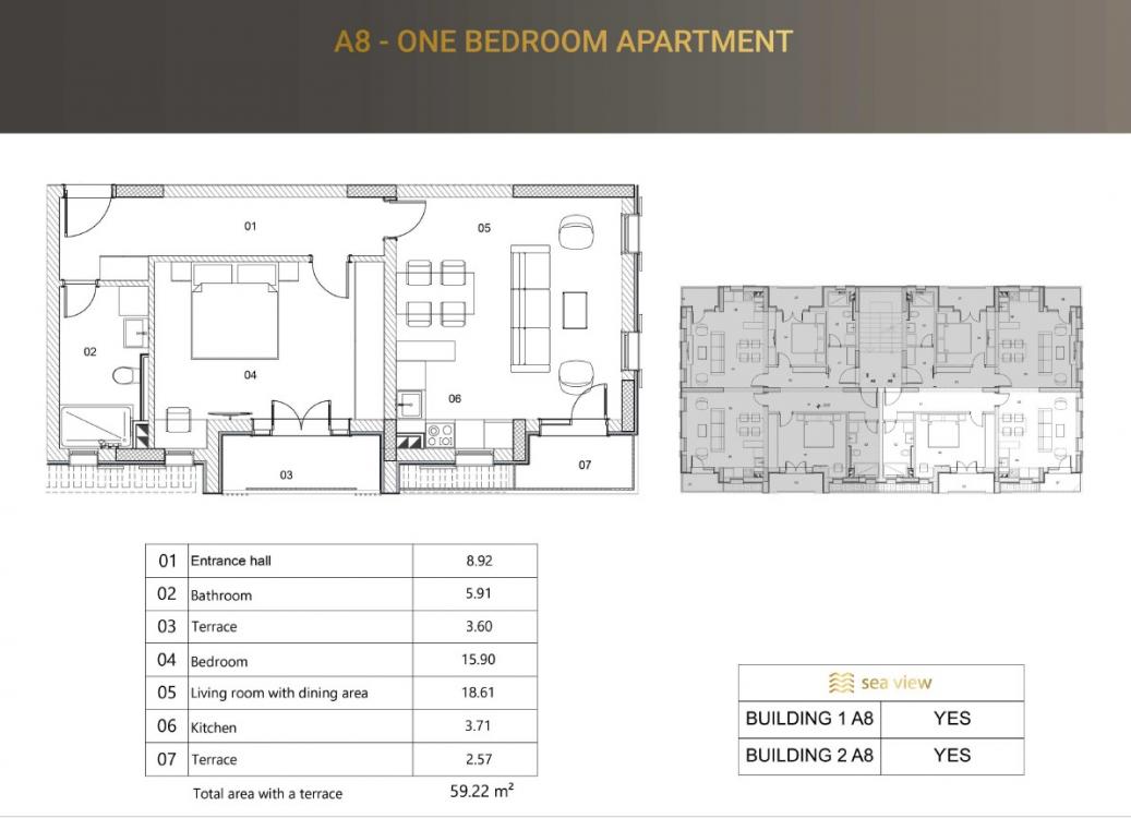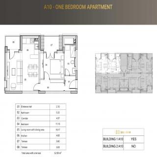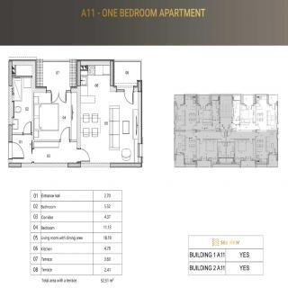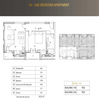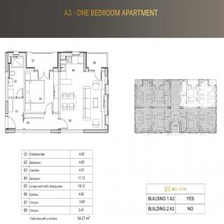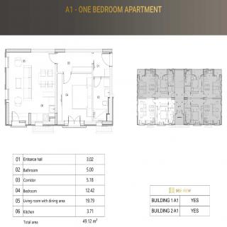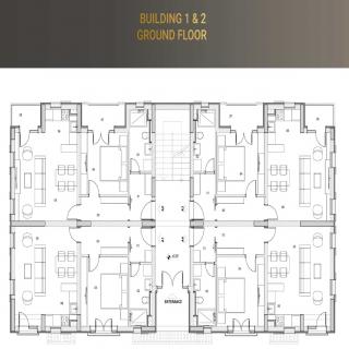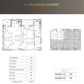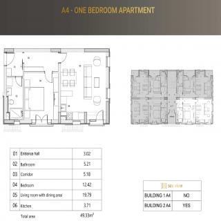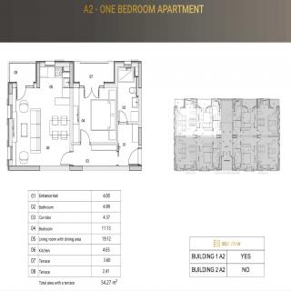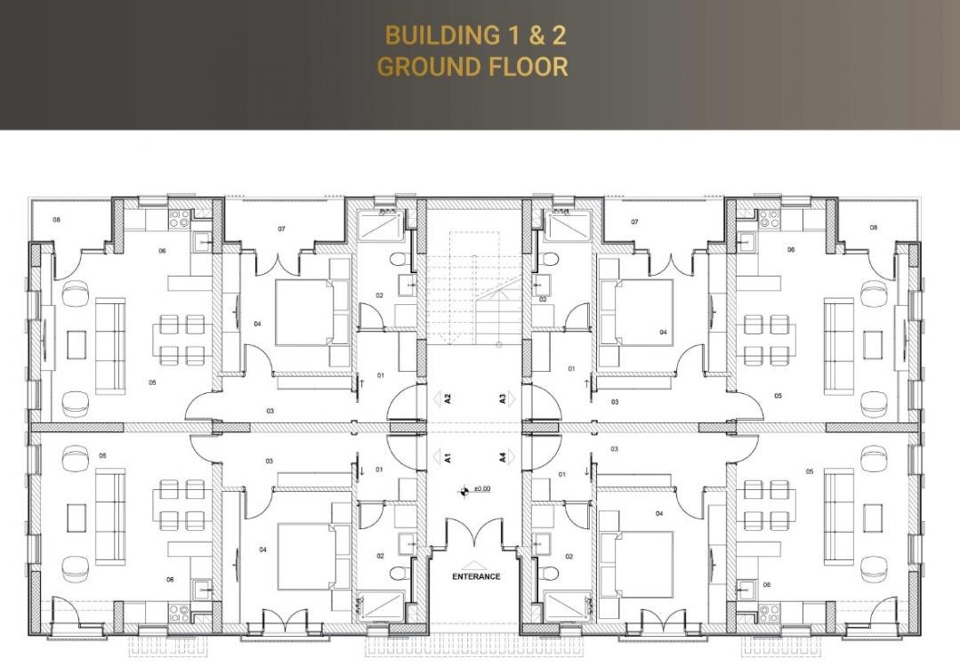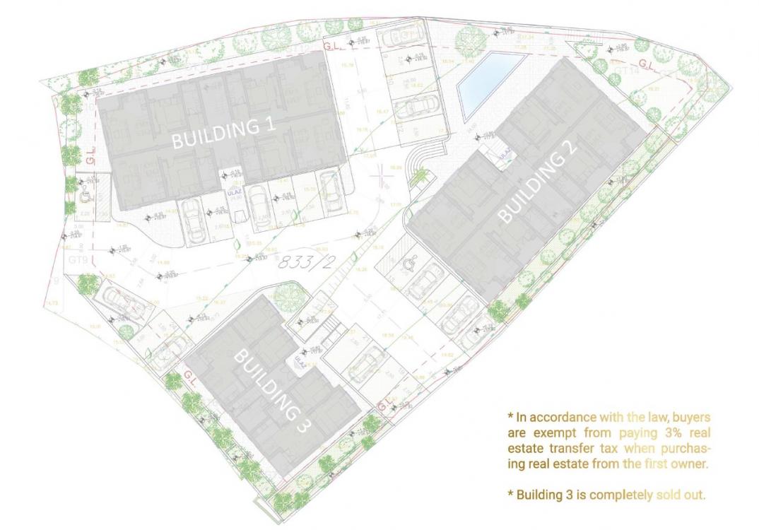 The complex occupies a plot of 2673 sq.m and consists of three three-story buildings. There are 32 apartments in total: 30 with one bedroom and 2 with two bedrooms.