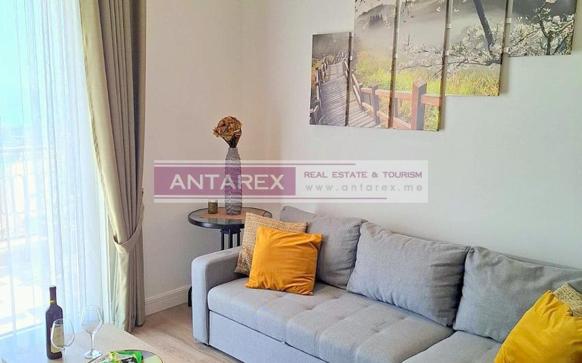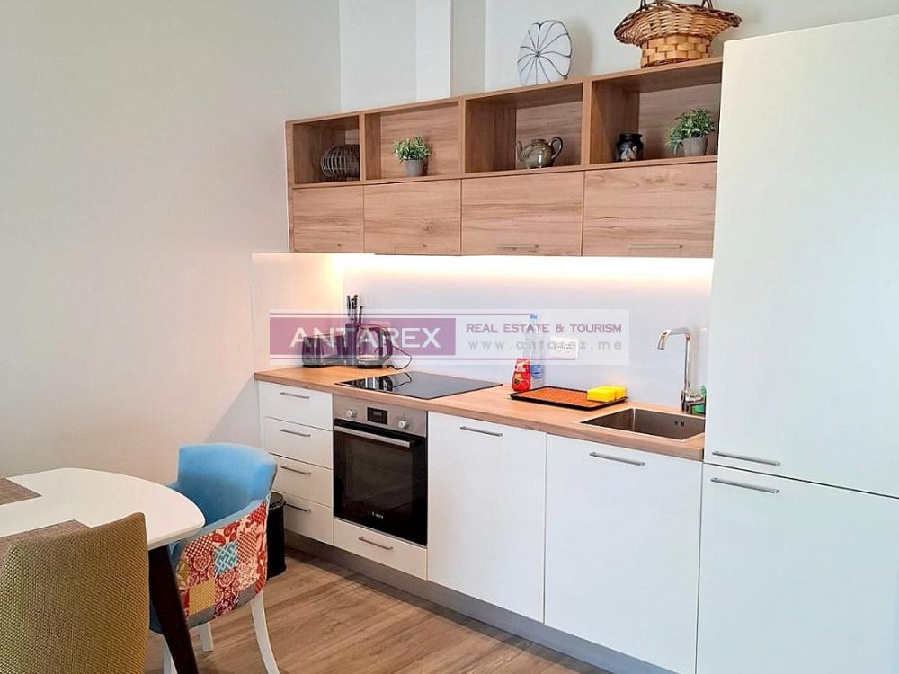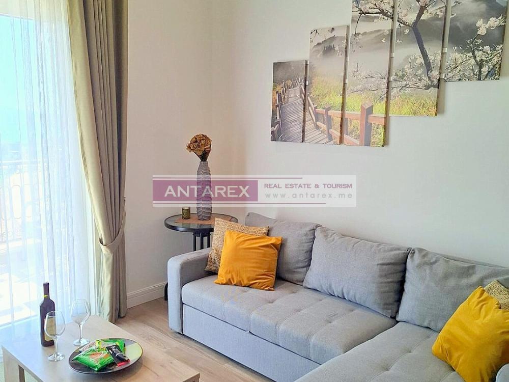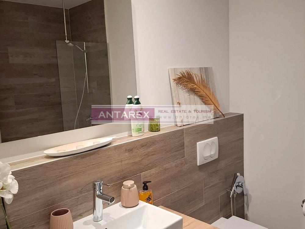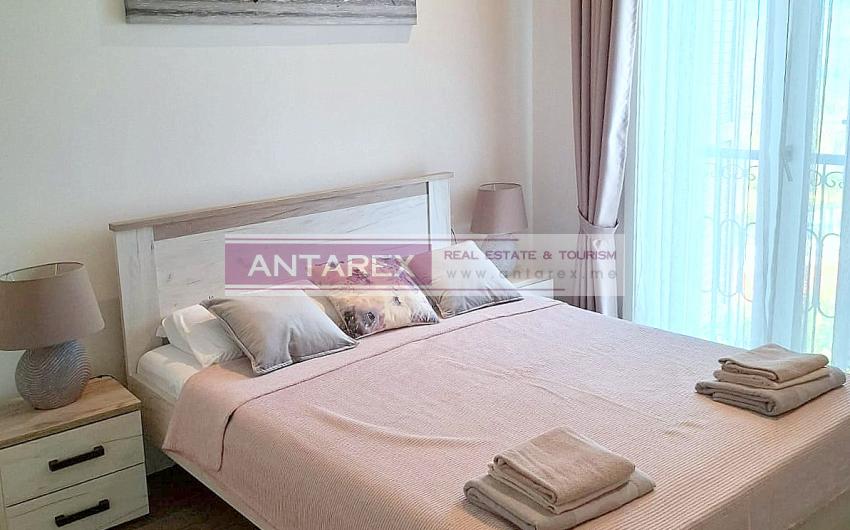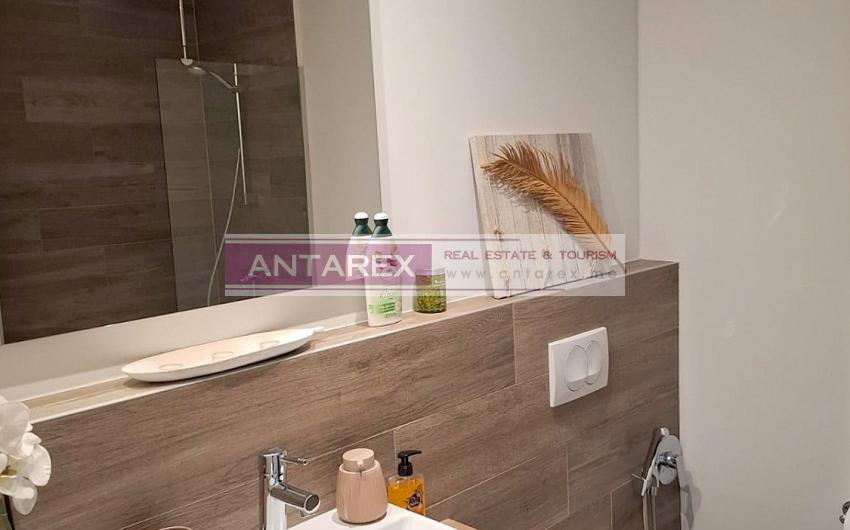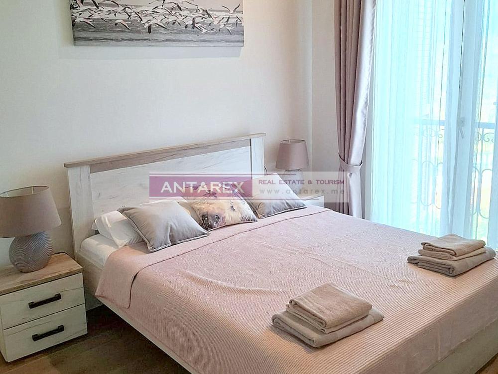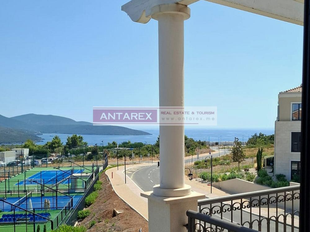This one-bedroom apartment is available for long-term rent in the renowned Lustica Bay complex. It is located on the second floor and offers sea views. It is fully furnished and equipped with underfloor heating throughout. One parking space is included.