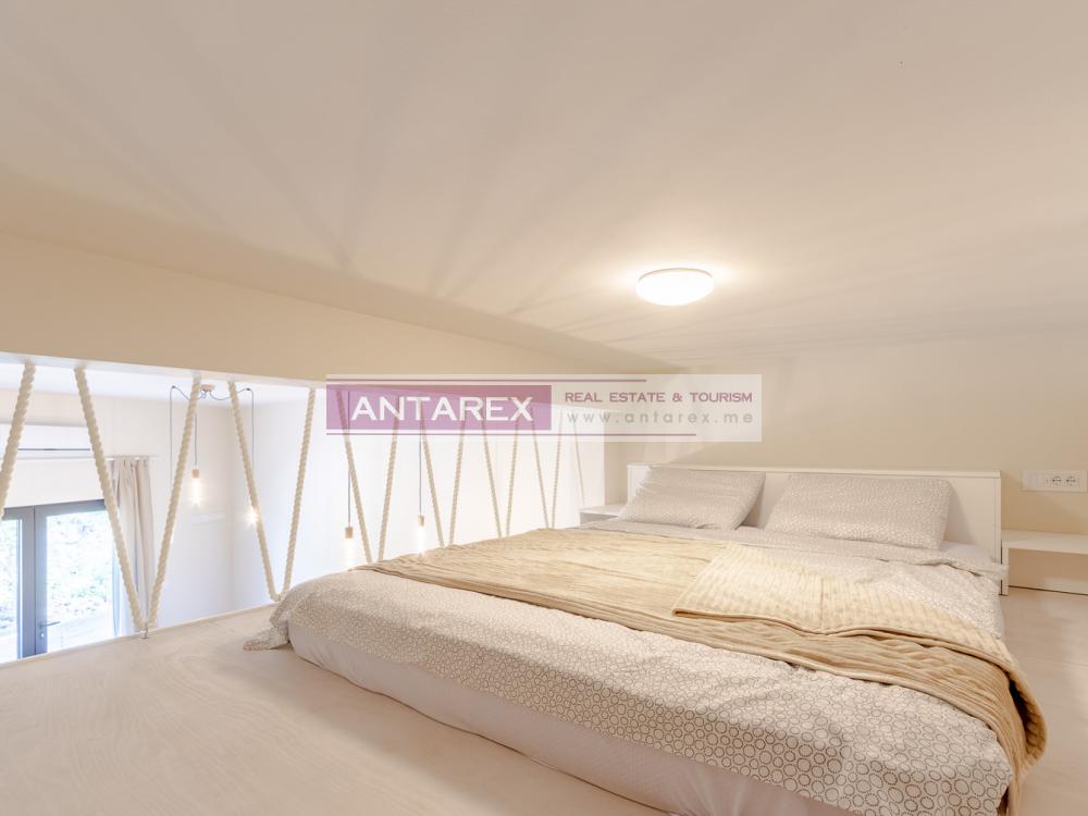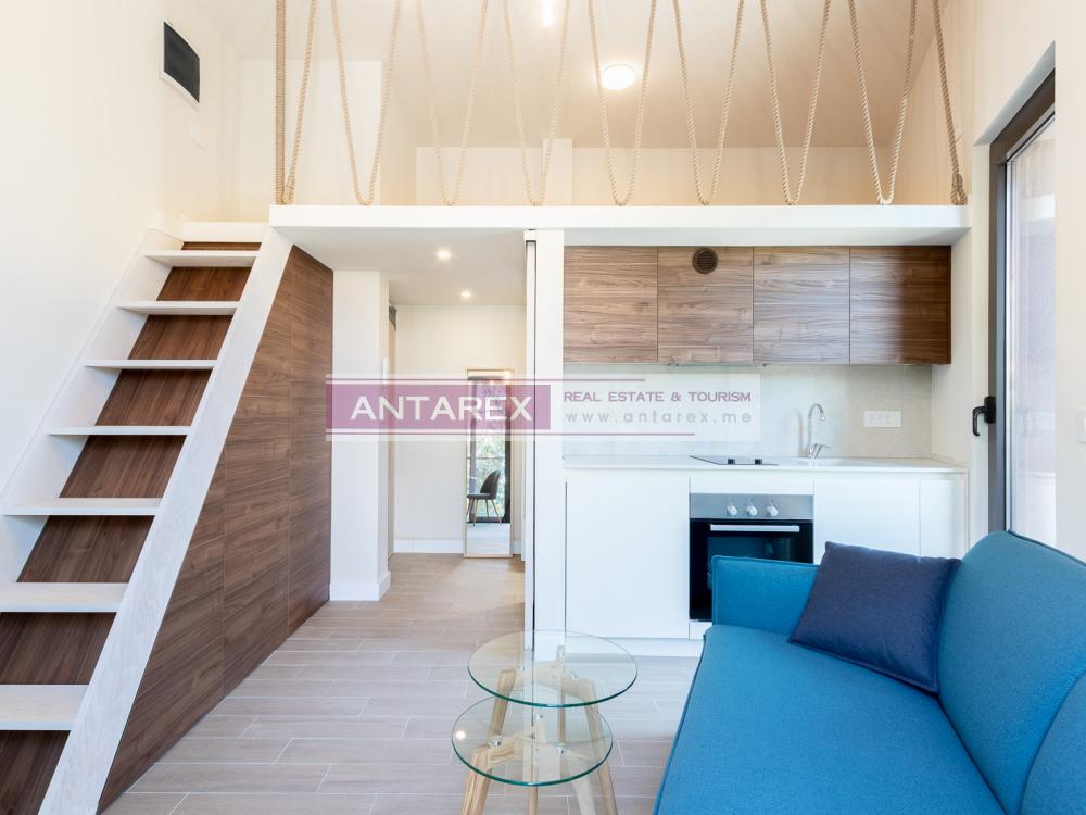 Studio apartment in Tivat for sale. The studio is located on the third floor (counting from the ground level) of a four-story building with an elevator. The area of the studio is 17 sq.m. plus a gallery of 9 sq.m., where a sleeping place is equipped. Sold with furniture and household appliances.